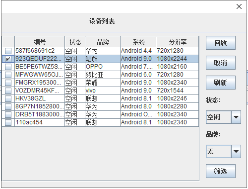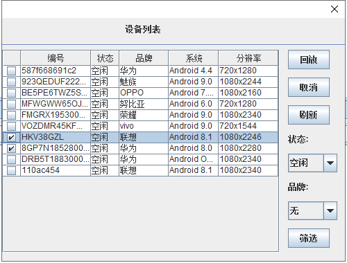 在执行菜单中,点击开始执行按钮,弹出设备列表页面,选择多个设备信息,点击回放按钮,弹出回放页面。
