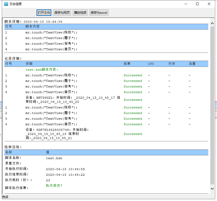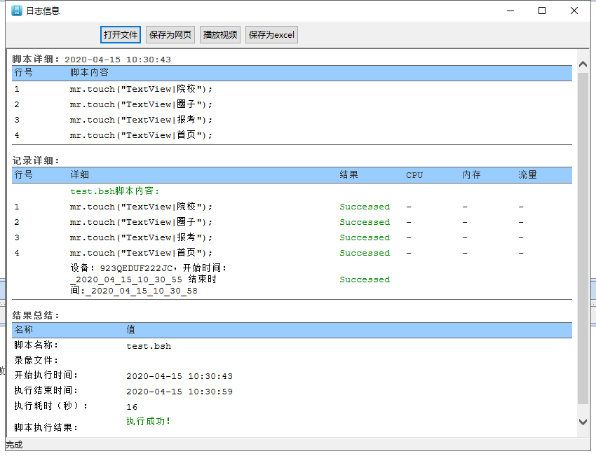 结果总结模块展示了脚本名称、录像文件的路径、开始执行时间和结束执行时间、执行耗时(秒)、脚本执行结果。