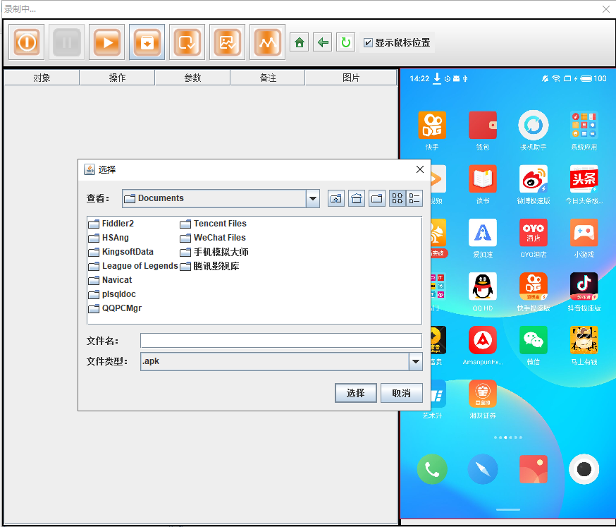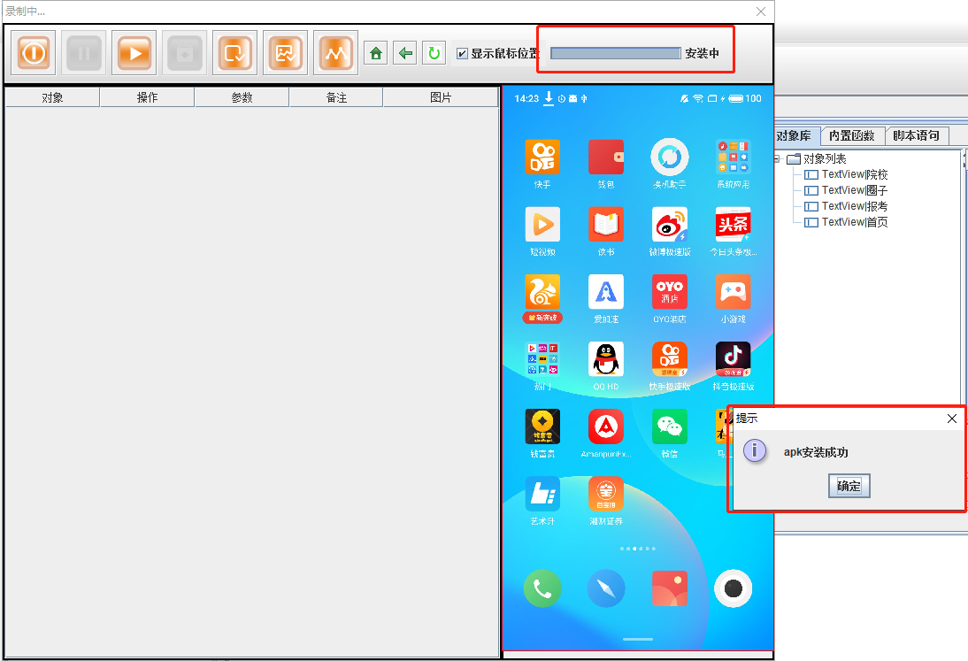 在MobileRunner的录制过程中,提供上传APP的功能。点击如图所示按钮,弹出文件选择框,选择您想要安装的APP即可开始安装,您可以在右上角看到安装进度条,安装成功后弹出如图提示框。