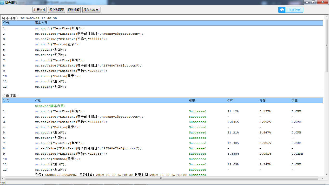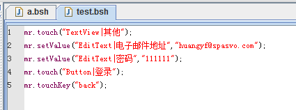 下面是将脚本的第二句和第三句进行参数化,使它执行上面参数表中的输入电子邮件地址为huangyf@spasvo.com密码为111111以及电子邮件地址为2574847848@qq.com密码为123456的操作,参数化脚本如下: