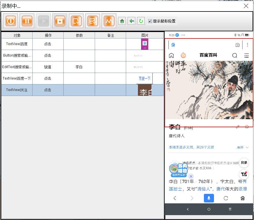 1.开始录制之前首先筛选状态空闲的手机 2.点击录制按钮,出现询问对话框 3.选择是否全新录制,点击确定 4.手机录制界面显示,进入录制中 5.打开百度app,输入搜索内容,点击“百度一下”,点击百度百科,录制区域记录了搜索操作的对象 6.点击暂停,可以暂停脚本录制 7.点击停止,可以停止录制,回到MR界面 |