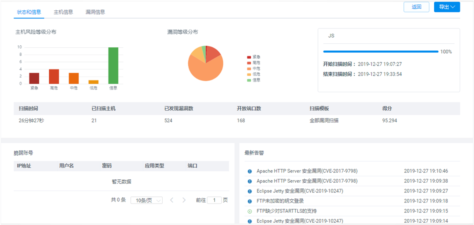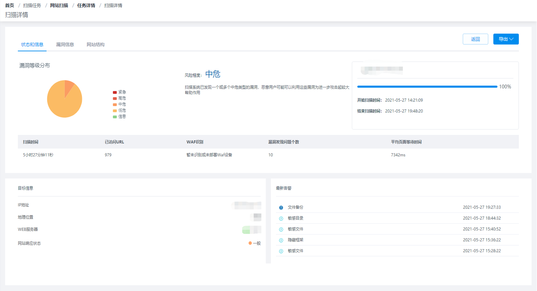 通过图表展示系统扫描的详细情况,包括漏洞信息、网站信息等