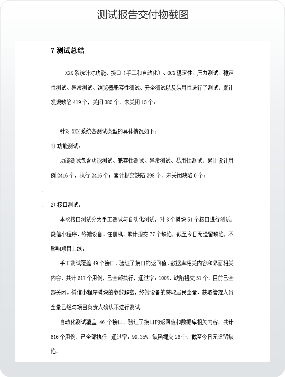 本公司从事测试服务20年,服务于银行、保险、证券、能源、医疗、军工、教育、政府、企业等行业,积累了各种测试解决方案,从测试用例设计到自动化测试、性能测试、兼容性测试、安全测试,具备丰富的经验和完善的解决方案。